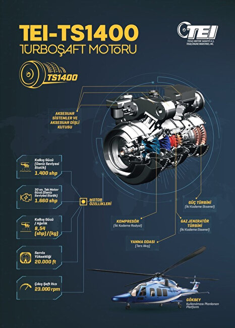 Savunma Sanayii Başkanlığı (SSB) Alt Sistemler Dairesi önderliğinde yürütülmekte olan proje kapsamında, bir yandan ülkemizde gaz türbinli motor tasarım, geliştirme ve test altyapıları oluşturulurken, diğer yandan da Özgün Helikopter’e entegre edilebilecek, 1400 shp gücünde, tip sertifikası alınmış özgün ve millî motor, TEI tarafından geliştiriliyor.