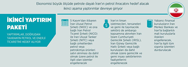 İkinci yaptırım paketi ise devreye giren ilk faza göre İran ekonomisi açısından çok daha önem arz ediyor. İkinci fazda Tahran yönetiminin enerji ticareti hedef alınıyor. İkinci fazda, başta petrol ve doğalgaz olmak üzere enerji ile ilgili tüm ürünlerin ticareti, yaptırım kapsamına alınıyor.