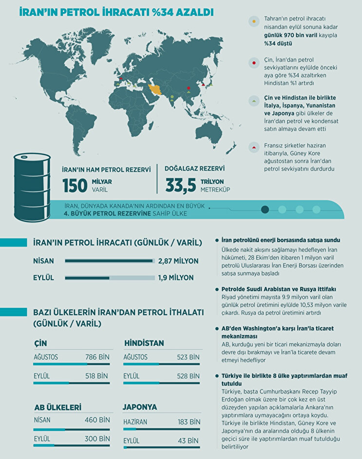 Mayısta günlük 2,7 milyon varil petrol ihraç eden İran, çeşitli tanker izleme verilerine göre, eylülde yaklaşık 1,9 milyon varil petrol sattı. Buna göre, Tahran'ın petrol ihracatında nisandan eylül ayının sonuna kadar günlük 970 bin varil kayıpla yüzde 34 düşüş gözlendi.