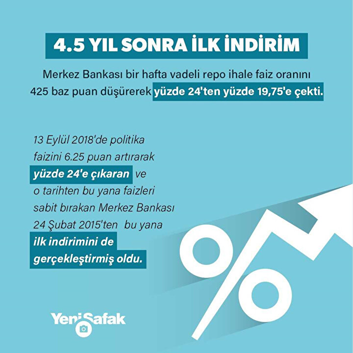 Türkiye Cumhuriyet Merkez Bankası, Para Politikası Kurulu faiz kararını açıkladı. Para Politikası Kurulu, politika faizi olan bir hafta vadeli repo ihale faiz oranını yüzde 24’ten yüzde 19,75’e indirilmesine karar verdi.