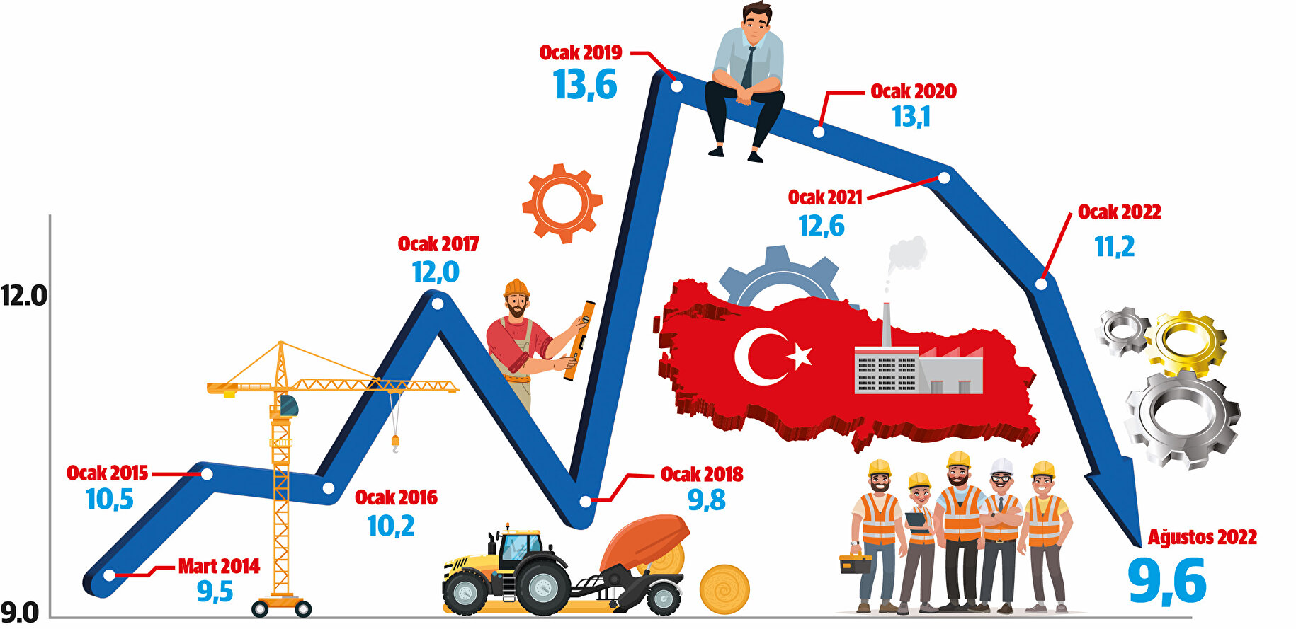 Yeni Ekonomi Modeli ile üretim, istihdam ve ihracat temelli büyüme stratejisini benimseyen Türkiye, bu uygulamanın meyvelerini almaya devam ediyor. Türkiye İstatistik Kurumu (TÜİK), ağustos ayına ilişkin iş gücü istatistiklerine göre; Türkiye'de işsizlik oranı, ağustosta bir önceki aya göre 0,4 puan azalışla yüzde 9,6 oldu. Böylece işsizlik oranı Ocak 2018’den bu yana ilk kez tek haneye geriledi. Ayrıca işsizlik oranı, geçen yılın aynı ayına göre ise 2,2 puan azalırken, Mart 2014 tarihinden bu yana en düşük seviyesine geriledi. 2014 yılının Mart ayında işsizlik oranı yüzde 9,5 olarak kayıtlara geçmişti.