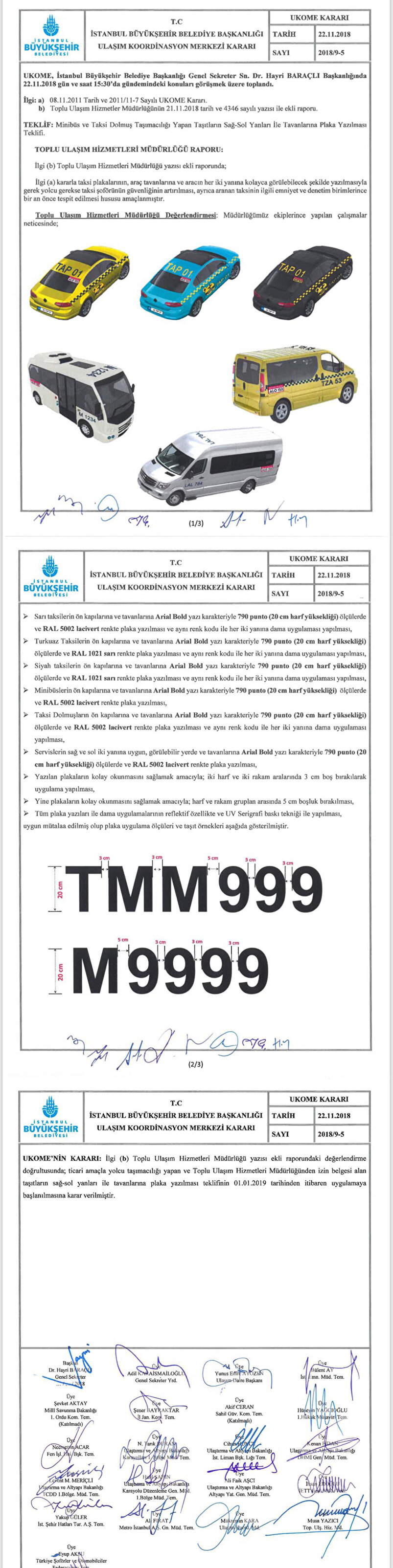 UKOME kararında plaka yazısının ticari taksilerde dahil servis ve dolmuş araçlarında nasıl yazılacağına yönelik standartlarda belirlendi.