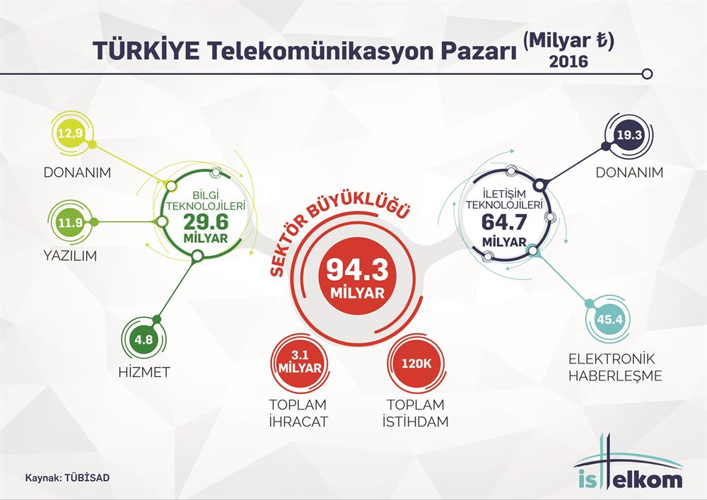 Türkiye de bilgi ve iletişim teknolojileri toplam sektör büyüklüğü yüzde 14,4’lük büyüme ile 2016 yılında 94,3 milyar TL’lik hacme ulaştı. Sektörün, toplam ihracat rakamı ise bir önceki yıla göre yüzde 32 artarak 3,1 milyar TL’ye ulaştı ve istihdam sayısı 120 bin kişi oldu. 2017 yılında da sektörde Türk lirası bazında çift haneli büyüme beklenmekte olup büyümede ar-ge yatırımı ve inovasyonun en önemli faktör olacağını belirtiliyor.