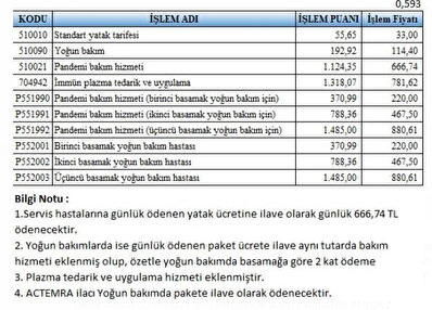 Yeni koronavirüs tanısı konulan her hasta için hizmet veren hastanelere de günlük 660 lira ödenmesine karar verildi. Yoğun bakım hizmetleri geri ödeme listesine alınarak yoğun bakım tedavi ücretleri de iki katına çıkarıldı. Yine yoğun bakım şartlarında, koronavirüs tedavisinde kullanılan ilaçlar da geri ödeme listesine alındı.