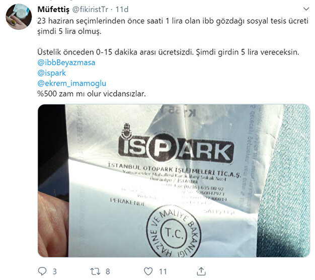 İSPARK tesislerinde her zaman ödedikleri ücretin, bölgelere göre değişkenlik göstermek üzere yüzde 30, 50 ya da 70 fazlasıyla karşılaşan İstanbullular neye uğradığını şaşırdı. Yüzlerce kişi tarafından, ağustos ayına ait fişler ve yeni tarife üzerinden ücretlendirilmiş İSPARK makbuzları sosyal medya üzerinden paylaşıldı. Aralarında yerel seçim sürecinde İBB Başkanı Ekrem İmamoğlu’nun ‘#herşeycokguzelolacak’ kampanyasına destek verdiği görülen pek çok vatandaş, ‘hani her şey güzel olacaktı bu zam nedir?’ ifadeleriyle belediye yönetimini açıklama yapmaya davet etti.