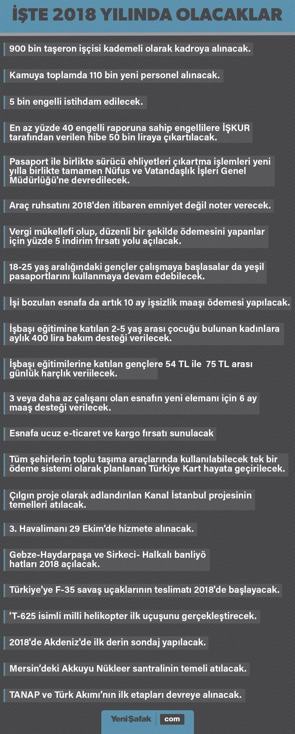 Öte yandan ehliyet, pasaport ve araç ruhsatlarında da kurum değişiklikleri yaşanacak.2018 yılında stratejik hedeflerde de önemli gelişmeler yaşanacak. F-35 savaş uçaklarının ilk teslimatı yapılacakken, TANAP ve Türk Akımı’nın ilk etapları da devreye alınacak, Akdeniz'de ise ilk derin sondaj yapılacak.