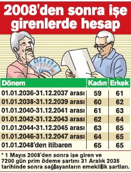 ● 2008’de yürürlüğe giren yeni Sosyal Güvenlik Kanunu’na göre; 1 Mayıs 2008 ve sonrasında iş hayatına adımını atanlar için emeklilik koşulları çok ağır. Bu tarihten sonra ilk defa sigortalı olanlar, 31 Aralık 2035’e kadar en az 7200 gün prim ödemiş olmak koşuluyla; kadın ise 58, erkek ise 60 yaşını doldurduğunda emekli olabilecek.