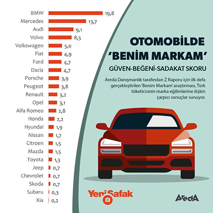 ‘Benim Markam’ araştırmasının sonuçları, Türkiye’nin en çok güvendiği, beğendiği ve sürekli tercih ettiği markaları ortaya koyuyor. Otomobil kategorisinde Türk tüketicisinin güven, beğeni ve sadakat ölçeğinde öne çıkardığı markalar piyasa satış sıralamasını yansıtmasa da Alman markalar oldu.