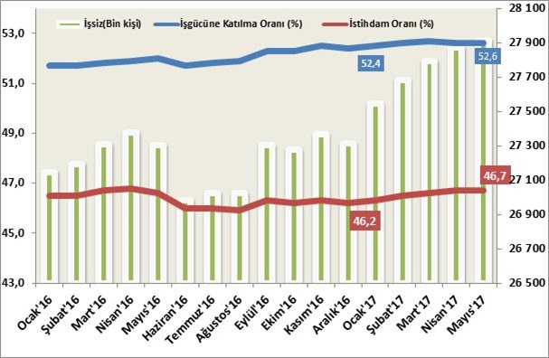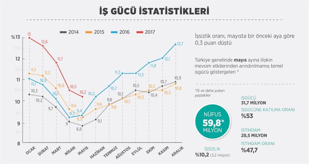 Nişantaşı Üniversitesi Ekonomi Masası Direktörü Murat Tufan, işsizlik oranının Ocak ayında yüzde 13 seviyesine ulaşması sonrası düşüşün devam ettiğini vurgulayarak, "Mayıs ayında yüzde 10,2 olan işsizlik rakamlarının detaylarına baktığımızda istihdam oranında artışın devam ettiğini görüyoruz. İstihdam edilenlerin sayısı 2017 yılı Mayıs döneminde, bir önceki yılın aynı dönemine göre 621 bin kişi artarak 28 milyon 488 bin kişi oldu. İstihdam oranı ise yüzde 47,7’ye yükseldi" dedi.
