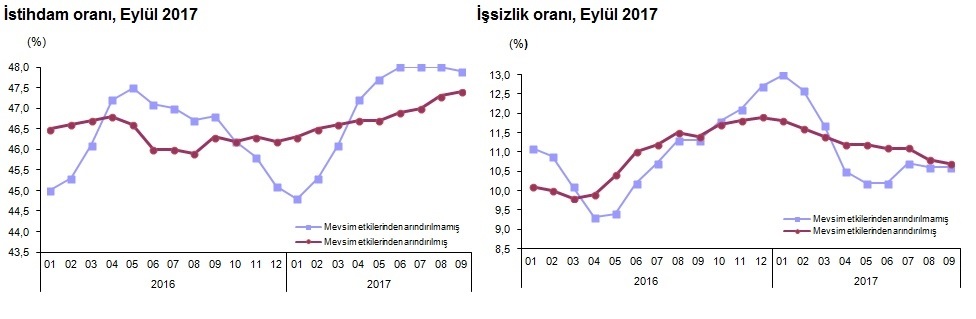 İşsiz sayısı 2017 yılı Eylül döneminde geçen yılın aynı dönemine göre 104 bin kişi azalarak 3 milyon 419 bin kişi oldu. İşsizlik oranı 0,7 puanlık azalış ile yüzde 10,6 seviyesinde gerçekleşti. Mevsim etkilerinden arındırılmış istihdam bir önceki döneme göre 137 bin kişi artarak 28 milyon 488 bin kişi olarak tahmin edildi. İstihdam oranı 0,1 puanlık artış ile yüzde 47,4 oldu.Ekonomistler, dün Cumhurbaşkanı Recep Tayyip Erdoğan tarafından açıklanan istihdam hedeflerinin işsizliği daha da aşağı çekebileceğini ifade etti.