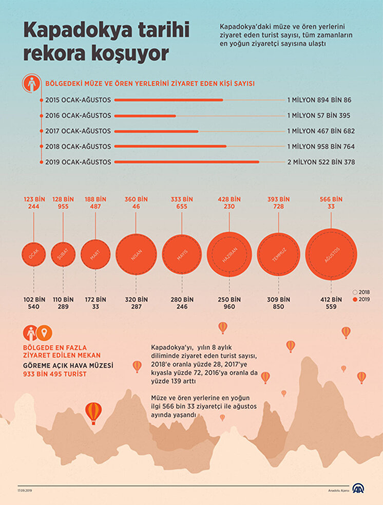 Kültür ve Turizm Bakanlığı verilerinden derlenen bilgilere göre peribacaları, doğal kaya oluşumlarıyla kaplı vadileri, yer altı yerleşim alanları, tarihi manastırları, mağara otelleri, sıcak hava balon turu ve çeşitli aktiviteleriyle turistlerin ilgisini çeken Kapadokya'yı, yılın 8 aylık diliminde ziyaret eden turist sayısı, 2018'e oranla yüzde 28, 2017'ye kıyasla yüzde 72, 2016'ya oranla da yüzde 139 civarında artarak 2 milyon 522 bin 378 oldu.