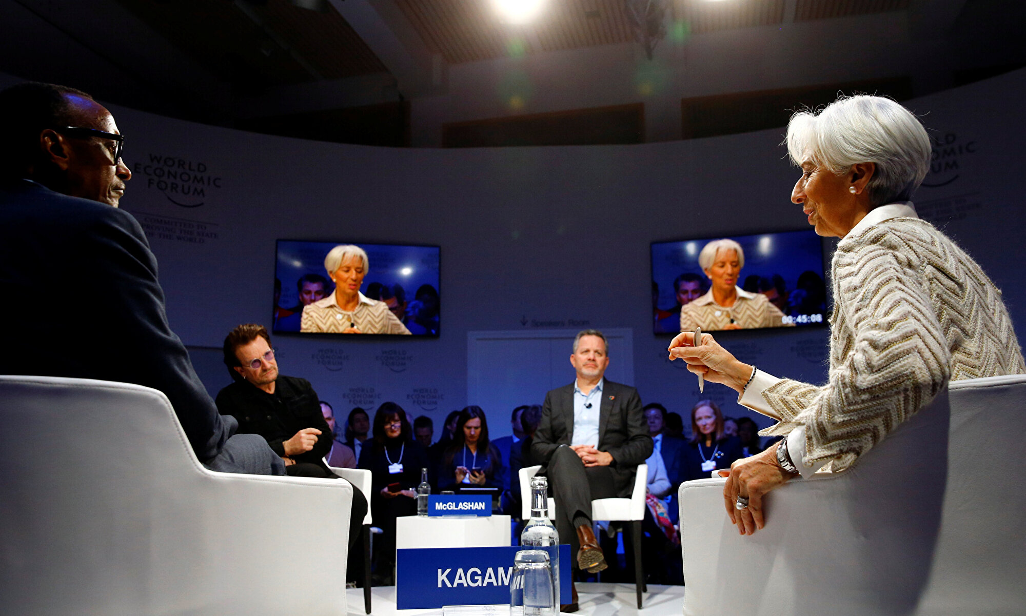 İsviçre'nin Davos kasabasında düzenlenen 49. Dünya Ekonomik Forumu'nda (WEF) konuşma yapan Bono, kapitalizmin, "herhangi bir diğer izm'den" daha çok sayıda insanı yoksulluktan kurtardığı ancak "erdemli" olmadığı değerlendirmesi yaptı. Uluslararası Para Fonuna (IMF) ilişkin görüşlerinin değiştiğini ifade ederek, Başkan Christine Lagarde'ı övdü.