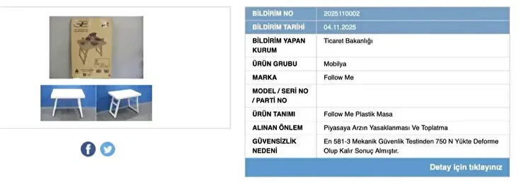 Ticaret Bakanlığı, piyasada satılan bir plastik masanın güvenlik şartlarını karşılamadığını tespit ederek, ciddi yaralanma riski taşıdığı gerekçesiyle ürünün toplatılmasına karar verdi.