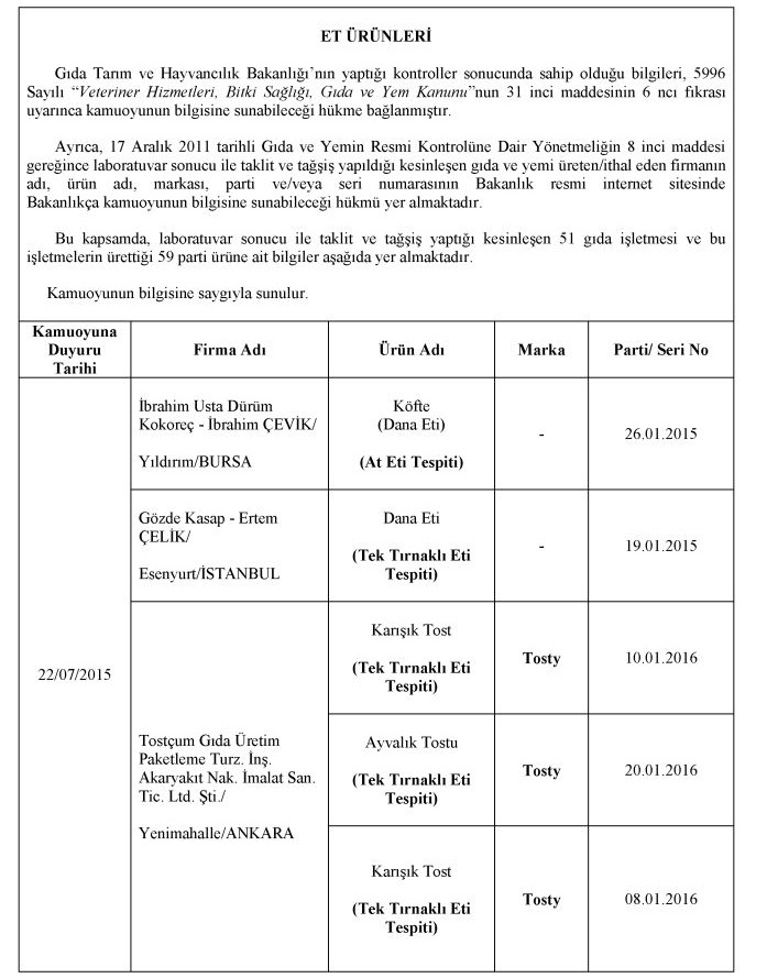Gıda, Tarım ve Hayvancılık Bakanlığı, at eti satan yerleri, taklit ve tağşiş yapılan, içeriğinde ilaç etken maddesi tespit edilen ürünleri açıkladı. Bakanlığın açıklamasına göre İstanbul, Ankara, Bursa ve Sakarya'da üretim yapan 7 firmanın sucuk, köfte, pişmiş kavurma, Ayvalık tostu ve çiğ etlere at eti koyduğu belirlendi.