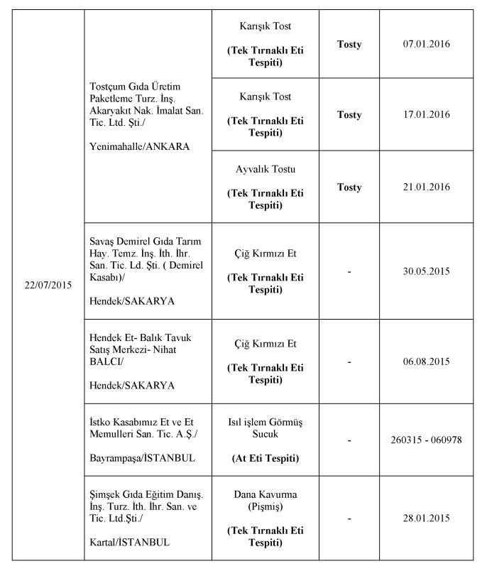Listede at eti satan yerler de isim isim ifşa edildi. Bakanlığın açıklamasına göre, mamulleri incelenen 7 firmanın, çiğ kırmızı et, sucuk, hazır köfte, pişmiş dana kavurma ve Ayvalık tostu ile karışık tosta at eti karıştırdığı ortaya çıktı.