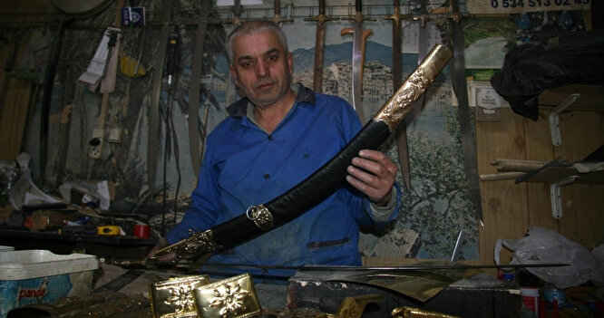 “Günümüzde tarihi diziler nedeniyle yaşanan aşırı talepten dolayı bazen siparişleri karşılayamıyoruz. Ahşap, deri, pirinç olmak üzere üç ana malzememiz var. Kınlarımız genelde bizim kılıç üreticilerine bağlı olarak ekonomik boyutta olduğu için fiyatı 170 TL’den başlıyor. Ama kişi veya imalatçı kının işlemelerini gümüş ya da bakır gibi başka bir metalden isterse ona göre fiyatı artıyor ve bin 500 TL’lere kadar çıkıyor. Çünkü gümüş ve bakır işlemeciliği farklı olduğu için kın fiyatları bin 500 TL’lere kadar çıkabiliyor.”