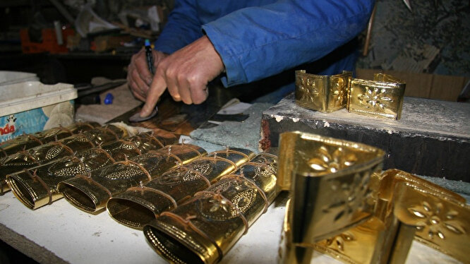 Ahşap, vinleks ve pirinç başta olmak üzere bakır veya gümüş gibi madenler kullanarak üç ana malzemeden kın üretimi yaptığını dile getiren Doğan, bir kının üretimin siparişe göre bir gün sürdüğünü söyledi.