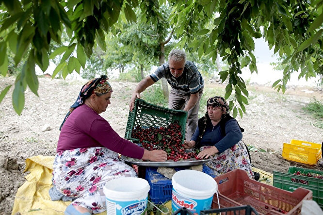 Akşam 17:00’ye kadar bahçede merdivenle çıktıkları ağaçlardan kirazları tek tek toplayan üreticiler, topladıkları bu kirazları kaliteli ve kalitesiz olmak üzere sınıflara ayırıyor. Kaliteli olanlar yurt dışına giderken, alt kalitede olanlar ise yurt dışında satılıyor. Ayırdıkları kirazları daha sonra tüccara götürüp satıyorlar. Kaliteli kirazlar kilosu 5 liradan satılırken, yağmurdan ve hava şartlarından zarar görmüş kirazlar ise 3 liradan satılıyor. Bir yevmiyeci günde 40 kilo kiraz toplarken, 100 lira yevmiye alıyor.