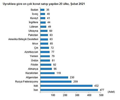 Türkiye İstatistik Kurumu'nun (TÜİK) verilerine, ülke uyruklarına göre en çok konut satışı İran vatandaşlarına yapıldı. Buna göre, Şubat ayında İran vatandaşları Türkiye'den 477 konut satın aldı. İran vatandaşlarını sırasıyla, 432 konut ile Irak, 259 konut ile Rusya Federasyonu, 230 konut ile Afganistan ve 119 konut ile Kazakistan vatandaşları izledi.