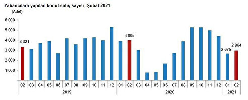 Yabancılara yapılan konut satışları, Şubat ayında ise, geçen yılın aynı ayına göre yüzde 26.0 azalarak 2 bin 964'e geriledi. Yabancılara yapılan konut satışlarında, Şubat ayında ilk sırayı bin 525 konut satışı ile İstanbul aldı. İstanbul'u sırasıyla 533 konut satışı ile Antalya, 211 konut satışı ile Ankara, 138 konut satışı ile Mersin ve 64 konut satışı ile Samsun izledi.