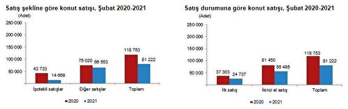 Türkiye genelinde şubat ayında 81 bin 222 konut satışı gerçekleştirildi. Şubatta satılan konut sayısı ocak ayına göre yüzde 15,06 artarken, geçen yılın aynı ayına göre yüzde 31,6 azaldı. Konut satışları yıllık bazda gerilemesine karşın aylık bazda temmuz ayındaki tarihi zirvenin ardından ilk kez artış kaydetti.