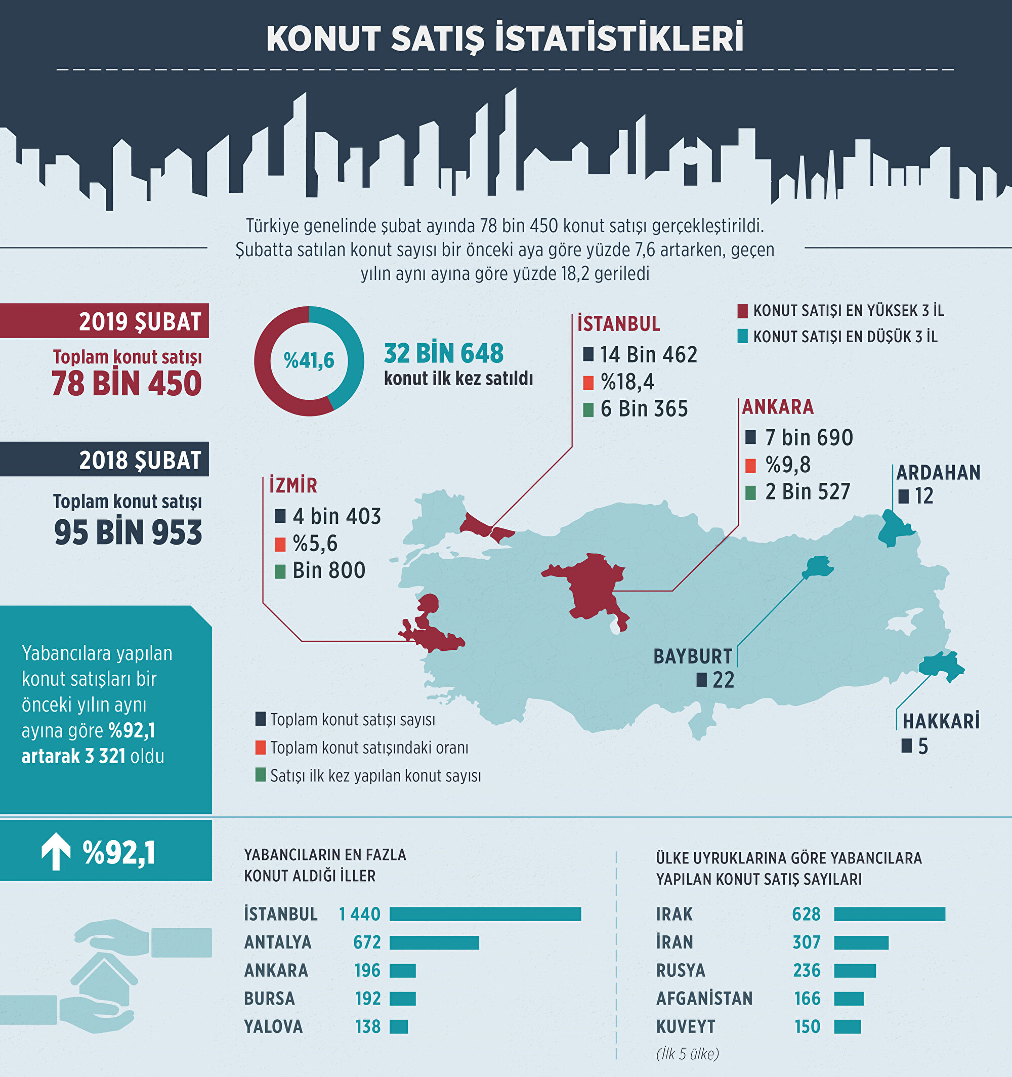 Yabancılara yapılan konut satışları bir önceki yılın aynı ayına göre yüzde 92,1 artarak 3 bin 321 oldu. Yabancılara yapılan konut satışlarında, Şubat 2019’da ilk sırayı bin 440 konut satışı ile İstanbul aldı. İstanbul ilini sırasıyla 672 konut satışı ile Antalya, 196 konut satışı ile Ankara, 192 konut satışı ile Bursa ve 138 konut satışı ile Yalova izledi.