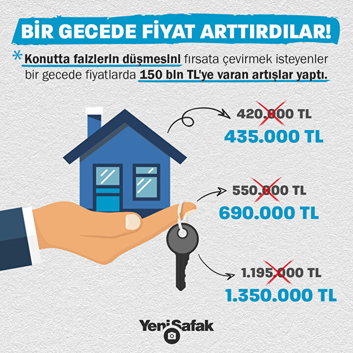 Konutta faizlerin tarihin en düşük seviyelerine gerilemesiyle ortaya çıkan finansman avantajını fırsata çevirmek isteyenler bir gecede satışa çıkardıkları konutların fiyatında 150 bin TL'ye varan artışlar yaptı. Kamu bankları fiyatlarında artış yapanların kredi paketlerinden yararlanamayacağının altını çizip 27 Mayıs uyarısında bulunurken, İstanbul Emlakçılar Odası ise; konut alacak vatandaşa ilan görsellerinin ekran görüntüleri ile itirazda bulunmaları yönünde çağrıda bulunuyor.