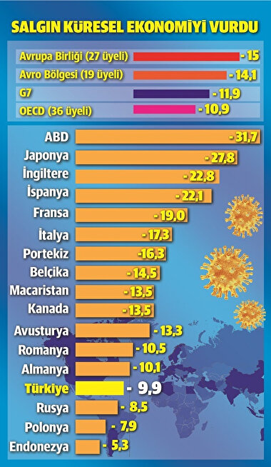 Hükümetlerin ve Merkez Bankalarının ekonomik aktiviteyi canlı tutmak için aldığı onca tedbire rağmen, dünyanın en büyük ekonomilerinin aldığı yara büyük oldu. Domino etkisiyle ülkeden ülkeye yayılan salgın, ABD başta olmak üzere dev ekonomileri yıktı geçti. Türkiye’nin yüzde 9,9 küçülmeyle atlattığı Nisan-Mayıs- Haziran döneminde ABD yüzde 31,7 küçülmeyle en büyük darbeyi alan ülke oldu. İkinci çeyrekte Japonya yüzde 27,8, İngiltere yüzde 22,8, İspanya yüzde 22,1 ve Fransa yüzde 19 küçüldü. 27 üyeli Avrupa Birliği bu yılın ikinci çeyreğinde ortalama yüzde 15 daralırken, ilk çeyrekte yüzde 6,8 küçülen Çin ekonomisi ise ikinci çeyrekte kısmen toparlandı ve yüzde 3,2 artıya geçti.