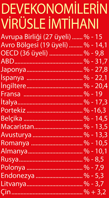 Hükümetlerin ve Merkez Bankalarının ekonomik aktiviteyi canlı tutmak için aldığı onca tedbire rağmen, dünyanın en büyük ekonomilerinin aldığı yara büyük oldu. Domino etkisiyle ülkeden ülkeye yayılan salgın, ABD başta olmak üzere dev ekonomileri yıktı geçti. Nisan-Mayıs- Haziran döneminde ABD’nin yüzde 31,7 küçülmeyle en büyük darbeyi yediği salgın nedeniyle Japonya yüzde 27,8, İspanya yüzde 22,1, İngiltere yüzde 20,4 ve Fransa yüzde 19 küçüldü.