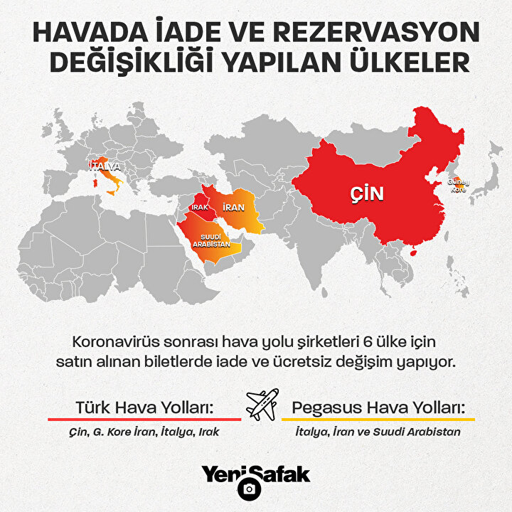 Türk Hava Yolları'nın web sitesinde yapılan ''Koronavirüs kaynaklı uçuşu iptal olan veya olmayan yolcularımıza tanınan haklar ve ayrıcalıklar'' başlıklı açıklamada iade ve ücretsiz rezervasyon değişikliği virüsün görüldüğü 5 ülke için tanımlanmış. Alım ve değişiklik için farklı tarihlerin baz alınarak değişim ve iade hakkı tanınan ülkeler Çin, İran, İtalya, Irak ve Güney Kore şeklinde sıralanıyor.