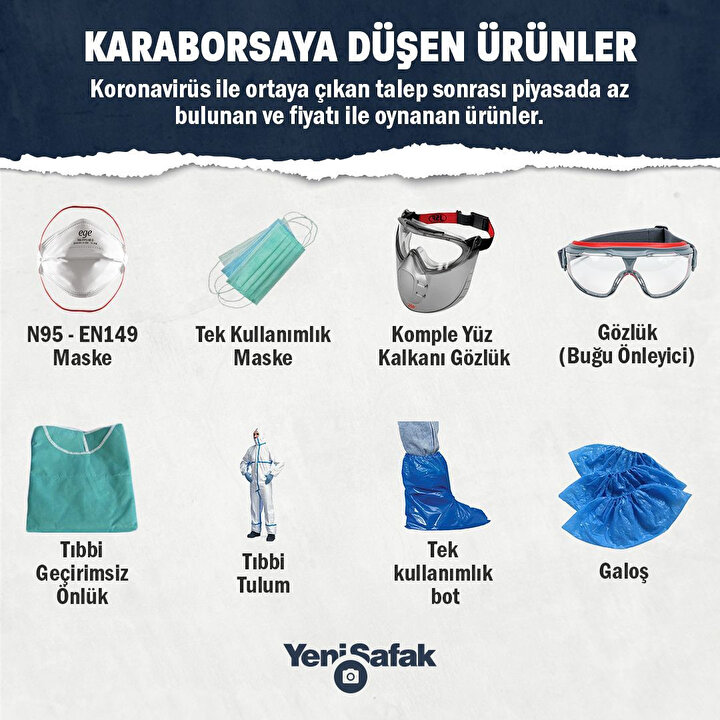 Virüsten korunmak için insanların en hızlı başvurduğu yöntemlerin başında gelmesinden kaynaklı görülmemiş bir talebin ortaya çıktığı koruyucu maskelerin yanı sıra medikal gözlükler, tıbbi geçirimsiz önlük, tıbbi tulum, karantina elbisesi, tek kullanımlık bot ve galoş da piyasada neredeyse bulunmayacak oranda az yer alıyor.