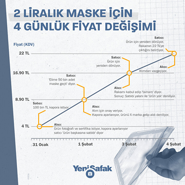 Çin'de ortaya çıkan virüs Türkiye pazarındaki bazı ürünlere olan talebi arttırınca simsarlara da gün doğdu. Ellerinde stoklu ürünler üzerinden sürekli fiyat arttıran kimi tedarikçiler normal fiyatı 1.5 - 2 lira olan maske için 4 liradan başlanan fiyat yolculuğunda 4 günün sonunda rakamı 22 liraya kadar çıkarabiliyor. Tabi fiyatıyla oynanan tek ürün maskeler olmuyor. Virüs sonrası medikal gözlüklerden tıbbi tulumlara kadar çok sayıda ürün de karaborsaya düşmüş durumda. Asıl sorunun ise Çin'deki bir çok fabrikada yaşanan aksaklıkların devam etmesi halinde şubat sonu, mart başında yaşanabileceği tahmin ediliyor.