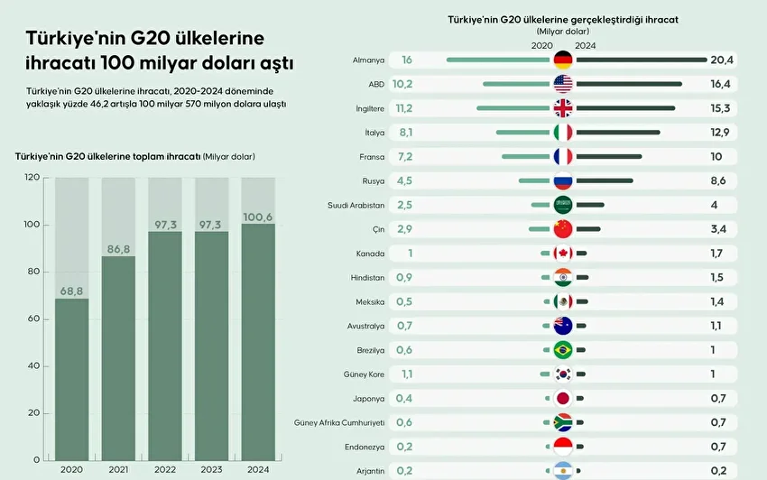 Türkiye'nin G20 ülkelerine ihracatı, 2020-2024 döneminde yaklaşık yüzde 46,2 artışla 100 milyar 570 milyon dolara ulaştı.