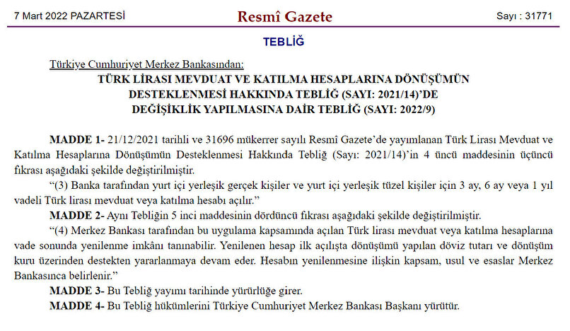 - MADDE 1-21/12/2021 tarihli ve 31696 mükerrer sayılı Resmî Gazete’de yayımlanan Türk Lirası Mevduat ve Katılma Hesaplarına Dönüşümün Desteklenmesi Hakkında Tebliğ (Sayı: 2021/14)’in 4 üncü maddesinin üçüncü fıkrası aşağıdaki şekilde değiştirilmiştir.