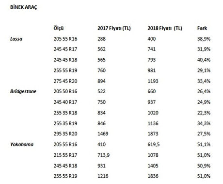 Türkiye İstatistik Kurumu (TÜİK) verilerine göre, araç lastiklerinin de dahil olduğu 'Araç Yedek Parça ve Ekipmanları' grubu, Ekim 2017'de 204 TL iken, aradan geçen bir yılda yüzde 70 artışla 350 liraya yükseldi. Söz konusu ürün grubunun içinde lastik ile birlikte otomobiller için tüm ekipmanların olduğunu belirtmekte fayda var.