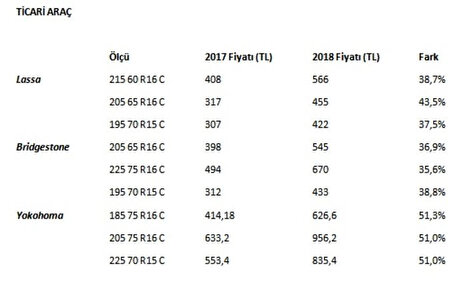 Yabancı bir markanın Türkiye'de ürettiği 195 70 R15 C boyutundaki başka bir lastikte de fiyat artışı bir yıl içinde yüzde 39'u buluyor. Başka bir yabancı markanın Türkiye'deki distribütörü aracılığı ile sattığı 185 75 R16 C ebadındaki diğer bir ticari araç kış lastiğinin bir yıllık fiyat değişimi ise yüzde 50'yi aşıyor.