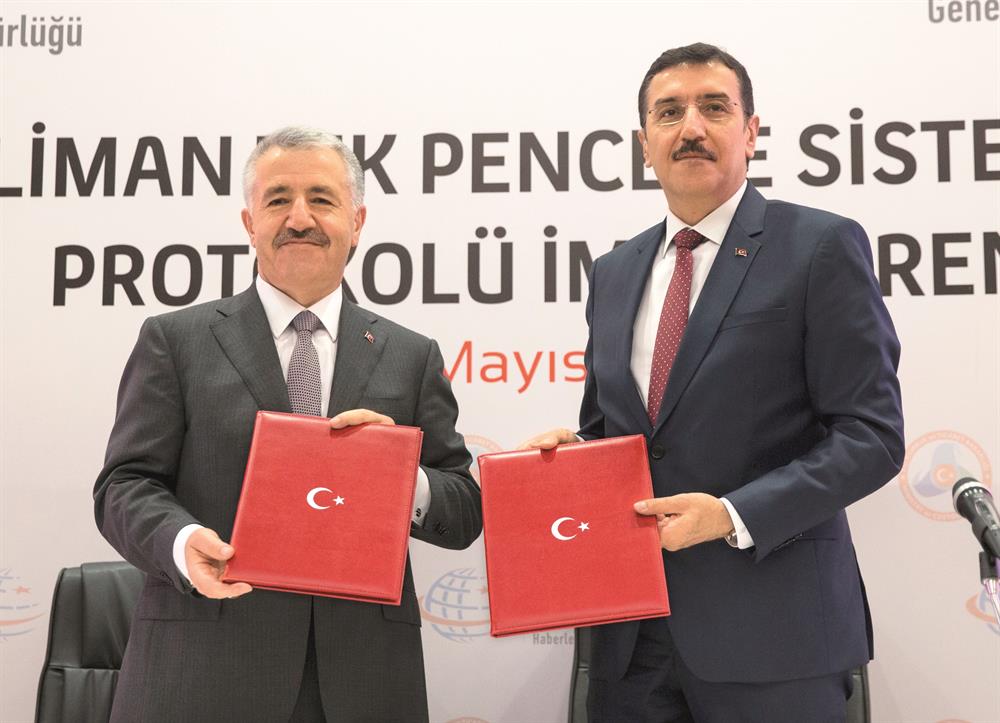 Dış ticaretin en önemli lojistik ayaklarından olan limanlara gelen gemilere ait bildirimlerin tek bir sistem üzerinden elektronik ortamda yapılmasına imkan sağlayacak "Liman Tek Pencere Sistemi Protokolü" imzalandı. Türkiye'nin 2023 hedeflerini yakalaması açısından önemli bir adım olan sistem sayesinde, bütün ilgili bakanlık ve kuruluşlar aynı veri tabanı üzerinden işlem yapmasını, işlemlerin hızlandırılmasını sağlayacak. Söz konusu protokole Gümrük ve Ticaret Bakanı Bülent Tüfenkci ile Ulaştırma, Denizcilik ve Haberleşme Bakanı Ahmet Arslan birlikte imza attı. Protokol imza töreninde konuşan Tüfenkci, söz konusu sistemin bakanlığın hedeflerine hizmet ettiğini söyledi. Türkiye'nin 2023 hedeflerini yakalaması açısından sistemin önemine değinen Tüfenkci, bakanlık olarak ticaretin daha kolay ve güvenli yapılmasını sağlayacak, hızını ve hacmini artıracak birçok proje yürüttüklerini ifade etti.