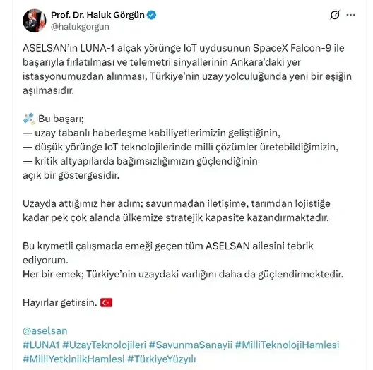 Görgün, "ASELSAN'ın LUNA-1 alçak yörünge IoT uydusunun SpaceX Falcon-9 ile başarıyla fırlatılması ve telemetri sinyallerinin Ankara'daki yer istasyonumuzdan alınması, Türkiye'nin uzay yolculuğunda yeni bir eşiğin aşılmasıdır. Bu başarı; uzay tabanlı haberleşme kabiliyetlerimizin geliştiğinin, düşük yörünge IoT teknolojilerinde milli çözümler üretebildiğimizin, kritik altyapılarda bağımsızlığımızın güçlendiğinin açık bir göstergesidir. Uzayda attığımız her adım; savunmadan iletişime, tarımdan lojistiğe kadar pek çok alanda ülkemize stratejik kapasite kazandırmaktadır. Bu kıymetli çalışmada emeği geçen tüm ASELSAN ailesini tebrik ediyorum. Her bir emek; Türkiye'nin uzaydaki varlığını daha da güçlendirmektedir. Hayırlar getirsin" dedi.