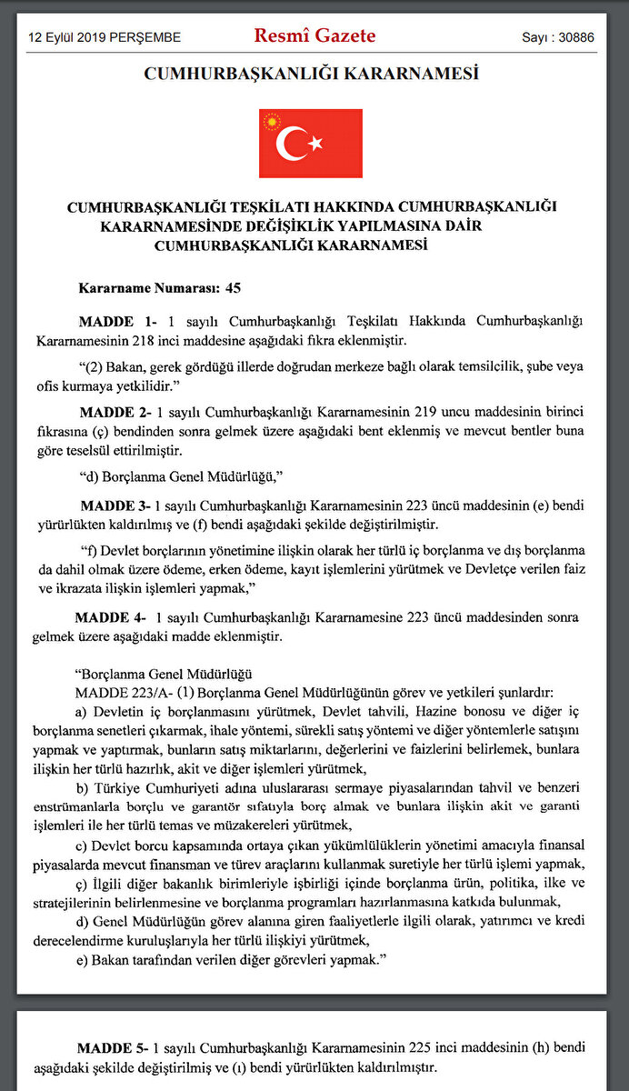 - Borçlanma Genel Müdürlüğü, Resmi Gazete’nin bugünkü sayısında yayımlanan ve Cumhurbaşkanlığı teşkilatı hakkında kararnamede değişiklik yapan kararnameyle oluşturuldu.