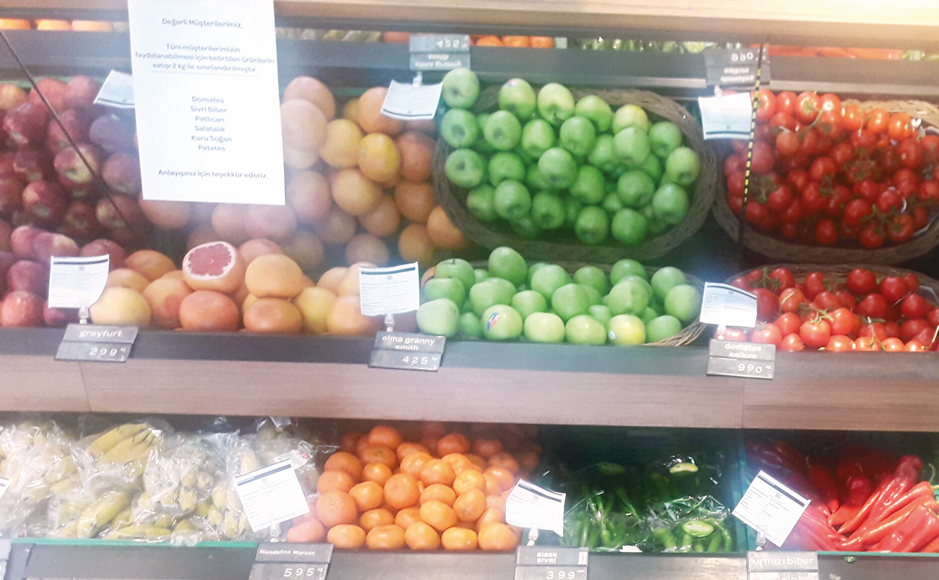 - İşin ilginç tarafı, zincir marketler de sadece etiketler değişmedi. Aynı zamanda mobil satış noktalarında uygulanan kilo sınırı, yani kota burada da uygulanmaya başlanmış. Carrefoursa’nın manav reyonunun doğru yöneldiğimde ise gözüme ilk çarpan şu yazı oluyor: “Değerli Müşterilerimiz, tüm müşterilerimizin faydalanabilmesi için belirtilen ürünlerin satışı 2 kg ile sınırlandırılmıştır. Domates, sivri biber, patlıcan, salatalık, kuru soğan, patates. Anlayışınız için teşekkür ederiz.” Carrefoursa’da konuştuğumuz manav reyonu görevlisi, bütün zincir mağazalarda bu indirim geçerli olduğunu belirtip şunu ekliyor: “Ama tanzimde seçme yok. Sıraya girip alıyorsun.”