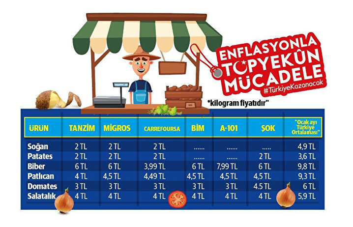 - Türkiye İstatistik Kurumu tarafından geçen hafta açıklanan Ocak ayı verileri ile karşılaştırıldığında pazar günü satışına başlanılan sebze fiyatlarında yarı yarıya hatta bunu da aşan farklar dikkat çekiyor. TÜİK verilerine göre; Ocak ayı Türkiye ortalaması 4,9 lira olan kuru soğan tanzim satış noktalarında 2 liradan, Ocak Türkiye ortalaması 6 lira olan domates ise 3 liradan satılıyor. Ocak ayı Türkiye ortalaması 3,6 lira olan patateste belediye satışı 2 liradan, Ocak’ta ortalama 9.3 lira olan patlıcanda ise tanzim satışları 4.5 liradan yapılıyor. Ocak’ta 5,9 lira olan salatalıkta satışlar 4 liradan, 9,8 lira olan biberde ise tanzimde 6 liradan tüketiciye sunuluyor.