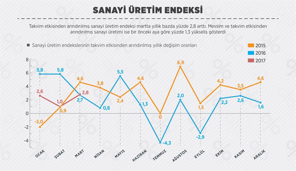 2017 yılı birinci çeyreğinde bir önceki çeyreğe göre mevsim ve takvim etkilerinden arındırılmış sanayi üretimi yüzde 1,4 arttı. Takvim etkisinden arındırılmış sanayi üretimi ise bir önceki yılın aynı çeyreğine göre yüzde 2,2 arttı.