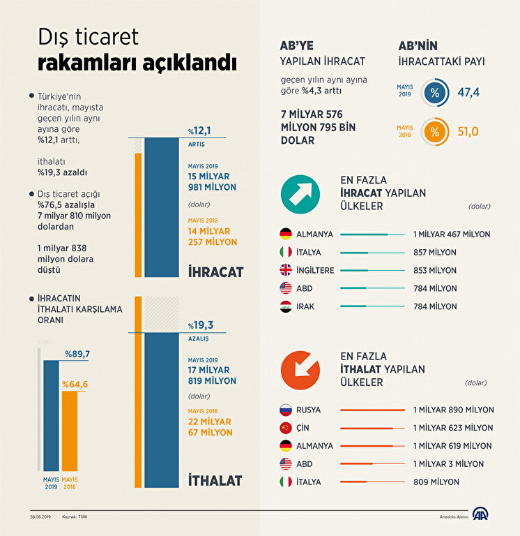 Türkiye İstatistik Kurumu ile Ticaret Bakanlığı işbirliğiyle oluşturulan geçici dış ticaret verilerine göre, İhracat 2019 yılı Mayıs ayında, 2018 yılının aynı ayına göre yüzde 12,1 artarak 15 milyar 981 milyon dolar, ithalat ise yüzde 19,3 azalarak 17 milyar 819 milyon dolar olarak gerçekleşti.