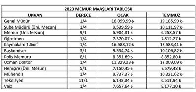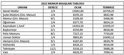 6,5 milyon memur ve memur emeklisine 2022 ve 2023 yıllarında uygulanacak maaş zamları belli oldu. 6. Dönem Toplu Sözleşme görüşmelerinde anlaşmaya varılmasının ardından beklenen imzalar gece yarısı atıldı. Varılan anlaşma doğrultusunda 2022'nin ilk 6 ayında yüzde 5 + enflasyon farkı, ikinci 6 ayında yüzde 7 + enflasyon farkı, 2023'ün ilk 6 ayında yüzde 8 + enflasyon farkı, ikinci 6 ayında ise yüzde 6 + enflasyon farkı oranında zam yapılacak. Ocakta enflasyon farkı hariç en düşük emekli maaşı 3.440 liraya yükselecek. İşte 2022 ve 2023 yıllarında uygulanacak yeni zamlı memur maaşları..