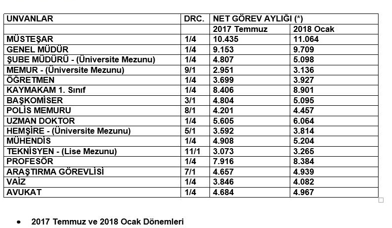Geçtiğimiz dönem toplu görüşmelerde, kamu görevlileri ile memur emeklilerinin tamamının maaş ve ücretlerinde yüzde 4 oranında artış öngörülmüştü. 2017 yılı ikinci altı aylık döneminde enflasyon yüzde 5,69 gerçekleşince, ilave yüzde 1,69 artış ile zamlara ilave edilmiş oldu. Bu çerçevede aile yardımı ödeneği dahil en düşük memur maaşı 2 bin 721 TL’den 2 bin 893 TL’ye yükseldi. 2018 yılı Ocak ayında memur emeklilerinin aylıklarında da enflasyon zammı dahil yüzde 5,69 oranında artış yapılmış ve en düşük memur emekli aylığı bin 871 TL’den bin 978 TL’ye çıkmış oldu.