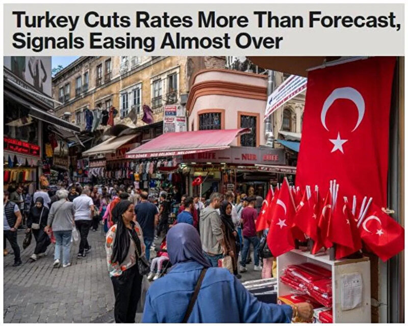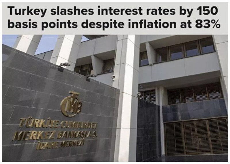 CNBC, "Türkiye, yüzde 83 enflasyona rağmen faiz oranlarını 150 baz puan indirdi." ifadesini kullandı.