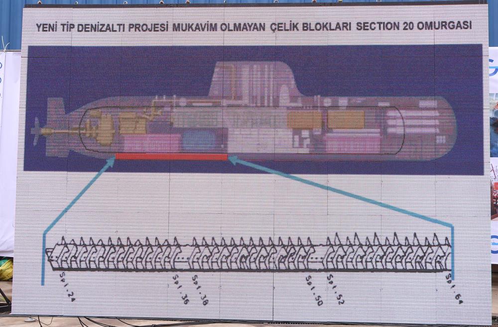Savunma Sanayii Müsteşarlığının 2,7 milyar dolar bütçeli Yeni Tip Denizaltı Projesi kapsamında imal edilen iç blokların ilk etap ürünlerinin teslimatı düzenlenen törenle yapıldı.Denizaltı bünyesinde bulunan hidrojen ve oksijen tanklarının tepkimesi sonucunda yakıt hücresi sistemiyle elektrik enerjisi üretilecek ve bu sistem atmosferik havaya ihtiyaç duymadan denizaltının çok daha uzun süre su altında kalmasını sağlayacak.