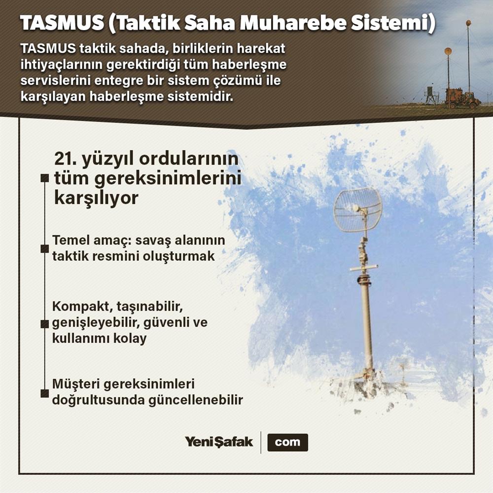 - 21.yüzyıl ordularının tüm haberleşme gereksinimlerini Ağ Merkezli Muharebe konseptine uygun şekilde karşılayan Taktik Saha Muhabere Sistemi’nin temel amacını, savaş alanının yakın gerçek zamanlı taktik resmini oluşturmak oluşturuyor. Silah, sensör ve komuta merkezleri arasında gerek duyulan yakın gerçek zamanlı data haberleşmesini sağlayan TASMUS, birliklerin coğrafi konumlarının bir merkezden otomatik ve sürekli olarak izlenmesini ve bu bilgileri gerektiğinde komuta katının kullanımına sunarak, komutanların ordu bölgesindeki tüm birliklerin taktik resmini gerçek zamanlı olarak görmesini sağlıyor.