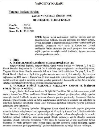Yargıtay, çalışanların sağlık sorunu nedeniyle işe devamsızlıkları sonucunda iş sözleşmelerinde yaşanan fesihlere yönelik önemli bir karar aldı. Uzun süreli sağlık raporları sonrasında ortaya çıkan haklı fesihte çalışanın savunmasının alınıp alınmayacağına yönelik ortaya çıkan belirsizliğe ilişkin Yargıtay tarafından yayımlanan İçtihat Birleştirme kararında savunma alınmasına gerek olmadığına hükmedildi.