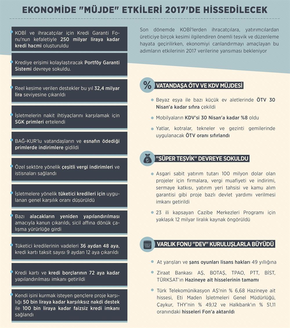 Türkiye ekonomisini canlandırmaya yönelik son dönemde KOBİ'lerden ihracatçılara, yatırımcılardan üreticiye birçok kesimi ilgilendiren önemli teşvik ve düzenleme hayata geçirilirken, bu adımların etkilerinin 2017 verilerine yansıması bekleniyor.